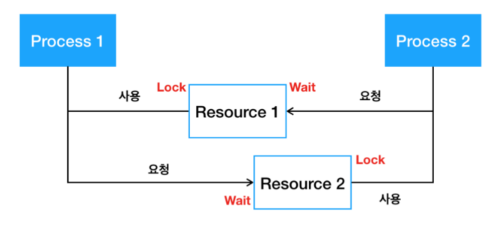 예) p1 이 공유자원 1을 선점한 상태에서 공유자원 2를 얻기 원하고, p2는 공유자원 2를 선점한 상태에서 공유자원 1을 얻기 원하는 상황
