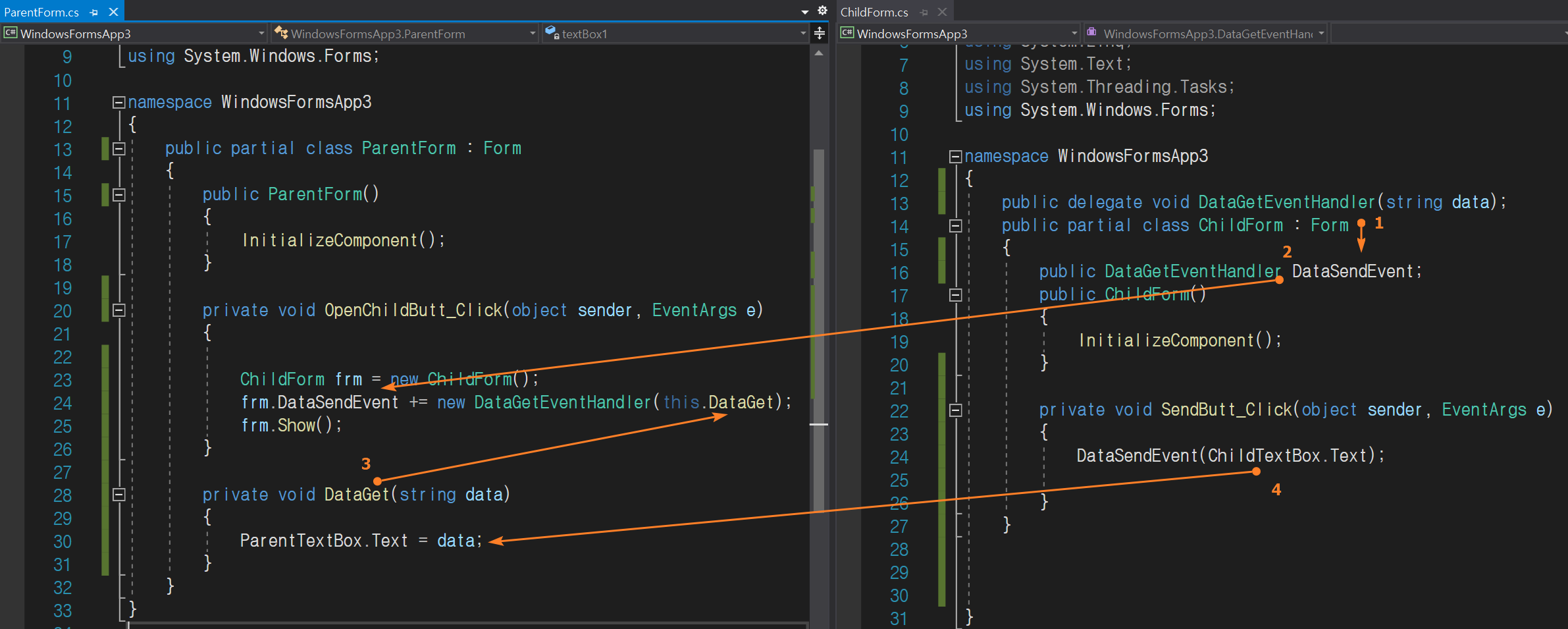 3번 : 우리가 선언해준 델리게이트 변수에 부모 폼에 있는 메서드를 할당해주었습니다. 앞에서 델리게이트는 C++의 포인터와 비슷한 역학을 한다고 했습니다. 그래서 이 대리인은 다른 폼에서 사용하여도 부모 폼에 있는 메서드가 호출이 됩니다. 바로 이 부분이 폼간 데이터 전달의 핵심이 되겠습니다. 이때 메서드와 델리게이트의 형식은 같아야 합니다.