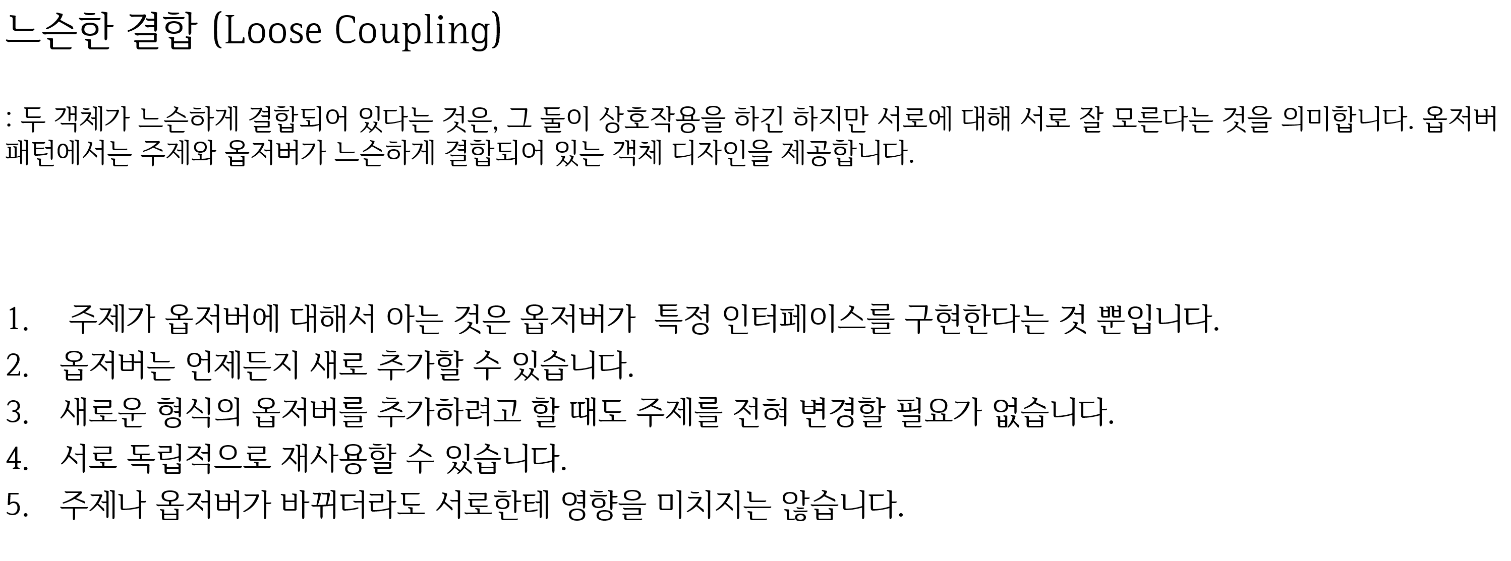 위에 있는 Subject 와 Observer 는 인터페이스를 의미합니다.