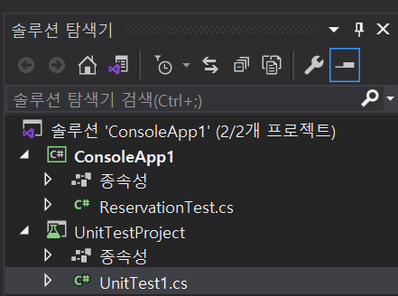 UnitTestProject 종속성 클릭 -> 프로젝트 우클릭 -> 참조추가 -> 테스트할 프로젝트 추가