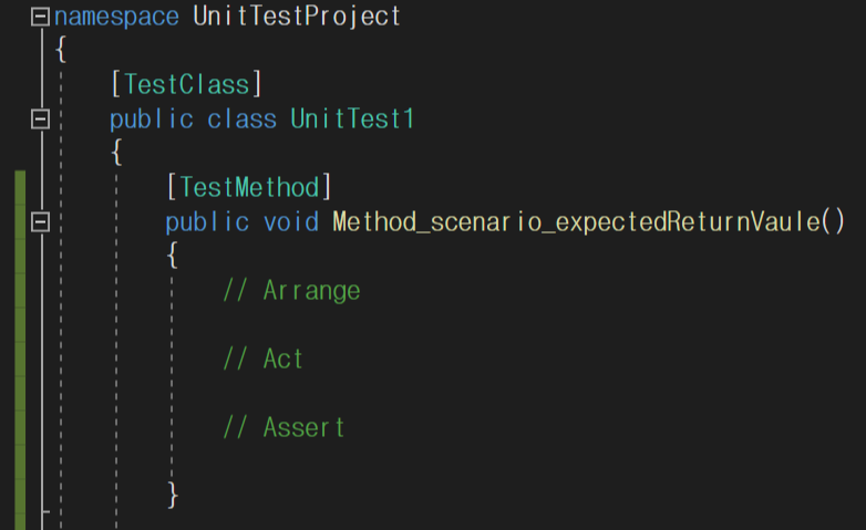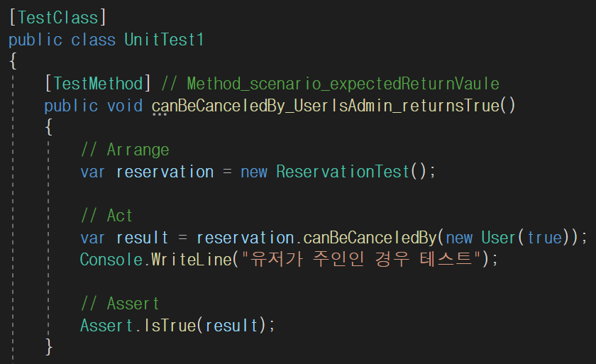 이제 테스트용 메소드를 구현할 건데, 여기서 이름을 먼저 보겠습니다. 이름은 보시는것처럼 테스트하려는 메소드의 이름, 간략한 시나리오 그리고 예상되는 결과값으로 작성해주시며 됩니다. 이렇게 안해도 당연히 돌아가지만, 약속정도로 생각하시면 됩니다.안에 내용은 Arrange, Act, Assert 세가지로 구성이 됩니다.