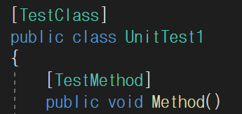 기본적인 C# 의 셋팅과의 차이는 이름 위에 [TestClass], [TestMethod] 라는 코드인데요. 이건 MsTest 에서 제공되는 특성(Attribute) 입니다. 말 그대로 저걸 클래스명 또는 메소드명 위에 적어주면, 이 코드뭉치는 테스트 코드로 사용할 것이라는 의미입니다.