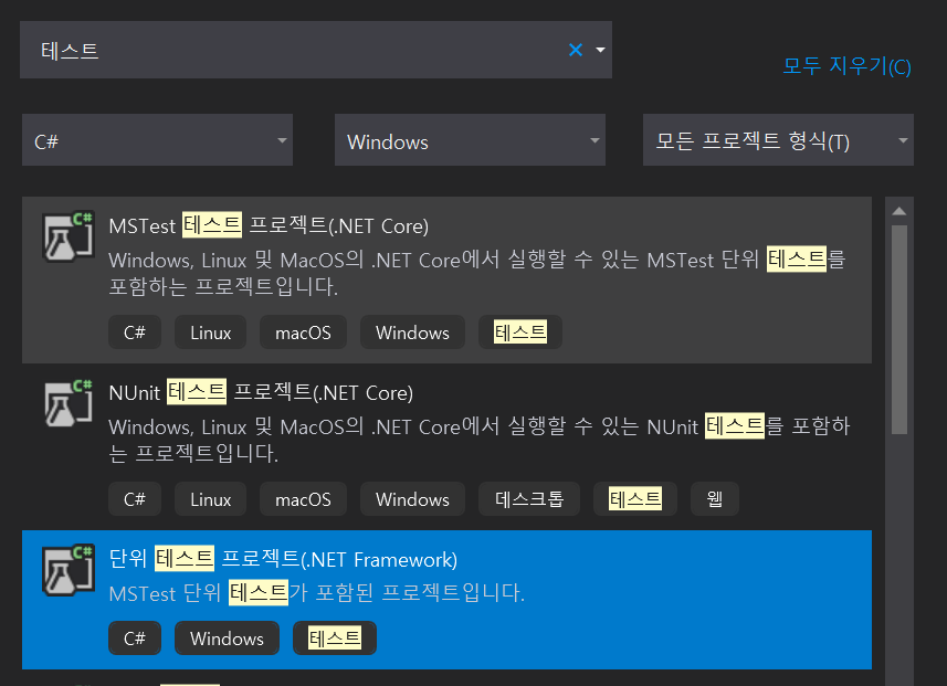 테스트 검색 -> 단위 테스트 프로젝트로 프로젝트 생성