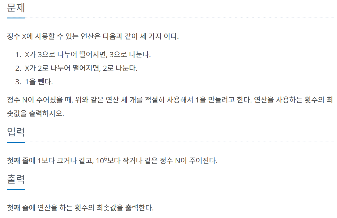 #include <bits/stdc++.h> using namespace std; int d[1000000]; int n; int main(void) { ios::sync_with_stdio(0); cin.tie(0); cin >> n; d[1] = 0; for (int i = 2; i <= n; i++) { d[i] = d[i - 1] + 1; if (i % 2 == 0) d[i] = min(d[i], d[i / 2] + 1); if (i % 3 == 0) d[i] = min(d[i], d[i / 3] + 1); } cout << d[n]; }반응형'백준 문제풀이 > Dynamic Programming' 카테고리의 다른 글