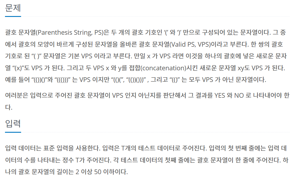 #include "bits/stdc++.h" using namespace std; bool compare(string str) { int len = (int)str.length(); stack<char> arr; for (int i = 0; i < len; i++) { char c = str[i]; if (c == '(') arr.push(str[i]); else { if (!arr.empty()) arr.pop(); else return false; } } return arr.empty(); } int main() { ios::sync_with_stdio(0); cin.tie(0); string str; int n; cin >> n; for (int i = 0; i < n; i++) { cin >> str; if (compare(str)) cout << "YES" << '\n'; else cout << "NO" << '\n'; } return 0; }반응형'백준 문제풀이 > etc' 카테고리의 다른 글