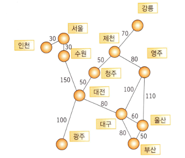 - 간선에 연결 강도를 표시할 수 있는 그래프 (ex 통행료, 간선의 길이 등)