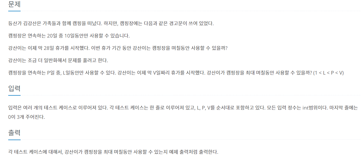 - L : 사용횟수 , P : 연속하는 일수 , V : 휴가 일수 를 입력받습니다.