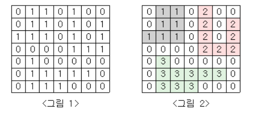<그림 1>과 같이 정사각형 모양의 지도가 있다. 1은 집이 있는 곳을, 0은 집이 없는 곳을 나타낸다. 철수는 이 지도를 가지고 연결된 집들의 모임인 단지를 정의하고, 단지에 번호를 붙이려 한다. 여기서 연결되었다는 것은 어떤 집이 좌우, 혹은 아래위로 다른 집이 있는 경우를 말한다. 대각선상에 집이 있는 경우는 연결된 것이 아니다. <그림 2>는 <그림 1>을 단지별로 번호를 붙인 것이다. 지도를 입력하여 단지수를 출력하고, 각 단지에 속하는 집의 수를 오름차순으로 정렬하여 출력하는 프로그램을 작성하시오.