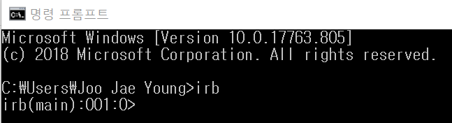 Ruby 의 경우 cmd 창에 irb 라고 입력을 하였을때 아래와 같은 화면이 나오면 정상적으로 설치된 것입니다.